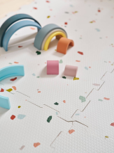 Tapete tipo tatami 180x180cm, para brincar, relaxar e fazer exercício, com rebordos direitos e amovíveis que permitem dar-lhe a forma desejada. Os 9 mosaicos em esponja permitem um encaixe fácil e retiram-se rapidamente para uma prática arrumação.