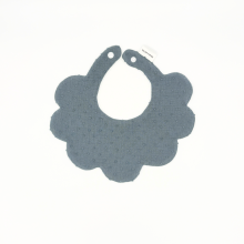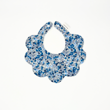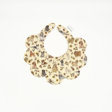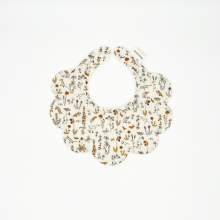 Scalloped baby bib showcasing a delicate animal and floral print in white and mustard tones. Perfect for first, going home outfits and neutral looks.