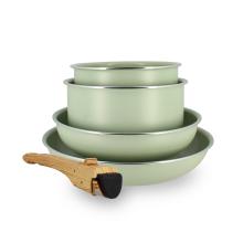 Interior covered with a 2-layer colored ceramic coating which includes: 2 saucepans of 16 and 18cm, 2 frying pans of 22 and 26cm as well as detachable handle with dark wood finish: saucepans 16/18cm, frying pans 22/26cm. Dress your kitchen in your style with different diameters and colors.