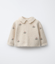 Strickpullover mit Bubikragen und langen Ärmeln. Knopfleiste hinten. Detail: Blumenstickerei.
