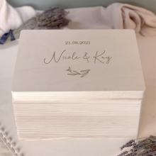 In dieser personalisierten Erinnerungskiste möchten wir all die besonderen Momente unserer Hochzeit und unseres gemeinsamen Lebens sammeln – von Karten über Fotos bis hin zu kleinen Erinnerungsstücken.