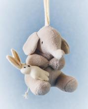 Children's soft toy in the shape of an elephant, holding a small bunny that makes a musical sound when pulled. Comes with a cord for hanging.