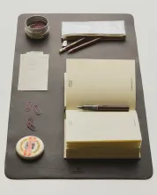 Sous-main en cuir pour bureau. De forme rectangulaire avec des coins arrondis. Comprend une sangle en cuir pour faciliter sa fermeture.