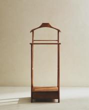 Valet de nuit en bois d’acacia comprenant une étagère dans le bas dotée d’un tiroir, un cintre au centre et deux barres horizontales pour les pantalons.