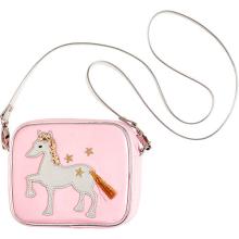 Een roze schoudertasje 'Marith' van het Nederlandse merk Souza for Kids, met een stijlvol wit paard vol glitters en harige staart op het laktasje. Het kindertasje is afgezet met een zilveren rand en heeft een zilveren schouderband. Het tasje sluit