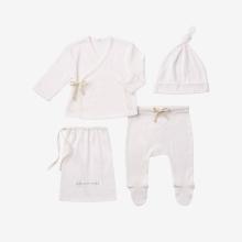 Welcome your little one home in the softest, most natural embrace with our bestselling organic layette set. Thoughtfully designed for baby's first moments, this timeless ensemble includes a kimono tie top, footed pants, a knotted beanie, and a reusable keepsake bag.