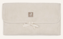 This changing mat has a soft ribbed outer fabric. The removable interior features a cute leaf print and is made from high-quality polyester. It includes practical storage pockets for diapers and other essentials, and closes easily with a bow. Perfect for on-the-go!