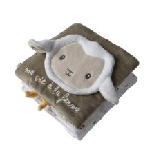large velvet activity book: Life on the Farm. It consists of five double-sided pages with charming illustrations on the theme of the farm, enriched with textures to touch, little sounds and shapes to manipulate.