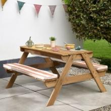 Cette petite table de pique nique en bois pour enfant, inspirée du charme provençal, invite aux moments de jeu et de partage en plein air ! Grâce à ses bacs sensoriels intégrés et son couvercle en bois, elle se transforme facilement en table d’activité pour enfant. Les deux coussins inclus ajoutent confort et style à cette table jardin enfant pensée pour les beaux jours.Remarque : Les accessoires montrés sur les photos, tels que les couverts, les jouets et les sets de table, ne sont pas inclus.