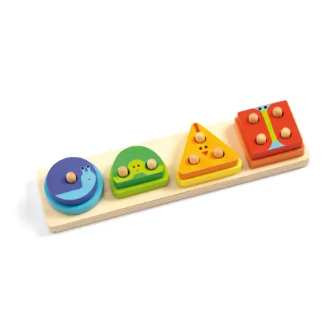 Un premier jeu d’encastrement en bois pour découvrir formes et couleurs. L’enfant empile et encastre 4 animaux : escargot, tortue, poule et coccinelle.