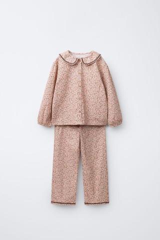 Pyjama deux pièces. Chemise avec col claudine et manches longues. Fermeture boutonnée sur le devant. Détail de dentelle à vagues avec couleur en contraste. Pantalon avec taille élastique.