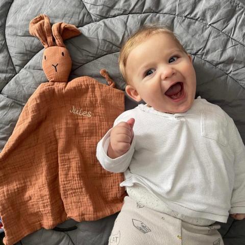 Découvrez nos Doudous à personnaliser en gaze de coton, avec ce petit + qui fait toute la différence : l’attache pour la tétine. Idéal pour bébé.