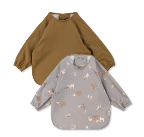 The dinner bib with long sleeves come in a 2-pack with different prints and colorsCleaning instructions:Wipe clean with a wet clothMeasurements: 30 x 30 cmStyle no.: KS2474