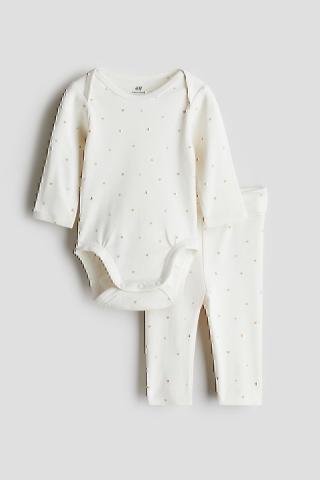 Set with a bodysuit and pair of leggings in supersoft cotton jersey. Long-sleeved bodysuit with lapped shoulders, press-studs at the crotch and gathered seams around the legs for a more comfortable and snug fit around the nappy. Leggings with a ribbed fold-over waist for a comfortable fit over the tummy.