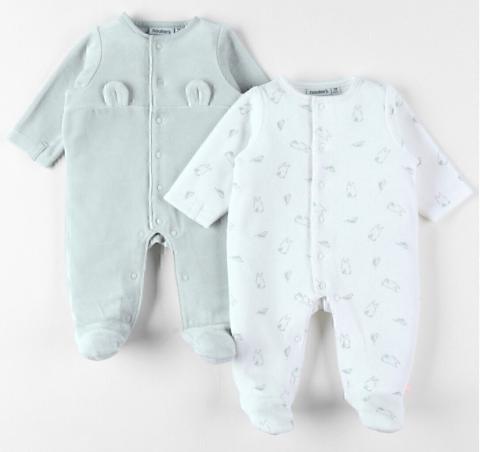 Cet ensemble de deux pyjamas en velours avec: un pyjama avec d'oreilles d'ours, tandis que l'autre est orné d'un ravissant imprimé d'oiseaux et de lapins.