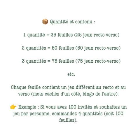 Ce produit est extrait d'une liste de mariage déposée sur Kadolog. Kadolog permet de créer des listes de mariage en toute liberté. Il est possible d'ajouter toutes vos envies cadeaux et de recevoir les dons directement sur votre compte. Avec les dons reçus, vous êtes alors libre d'aller acheter vos produits (comme ce '25 Jeux pour les invités du Mariage ') où et quand vous le souhaitez.
