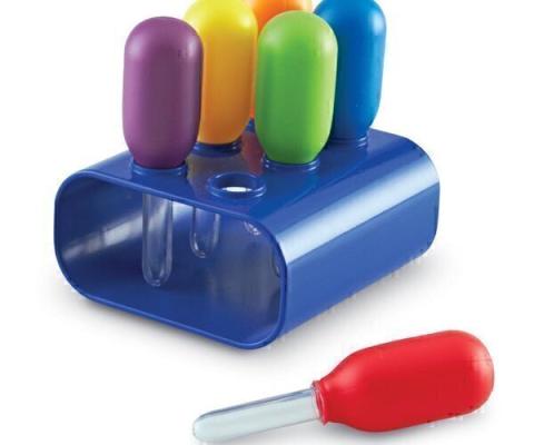 Deze jumbo pipetjes van Learning Resources zijn een perfecte aanvulling voor elk wetenschappelijk experiment of voor zintuigelijke activiteiten.  De buisjes zijn gemaakt uit stevig plastic, hebben elk een gekleurd knijpertje en komen met een opbergrekje.  Ze zijn 11,5 cm hoog en heel handig om te hanteren voor kleine h