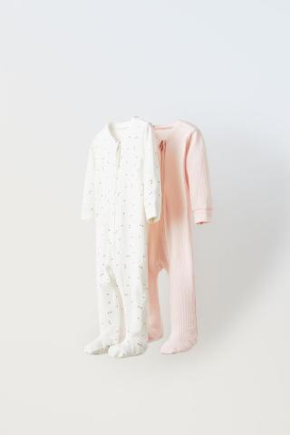 Lot de deux pyjamas une pièce à col rond et manches longues réglables. Fermeture zip sur le devant.