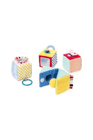 Un cube c'est bien, quatre cubes d'éveil en tissu, c'est encore mieux ! Leur texture douce et leur taille adaptée facilitent la préhension pour votre bébé. A son rythme, il les découvre un par un puis tous ensemble. Les nombreuses couleurs, textures et matières sont destinées à mettre ses sens en éveil. Que ce soit les ailes de l'oiseau ou de l'abeille en papier bruissant, le visage rassurant, les petites billes qui font du bruit, les étiquettes colorées, le miroir , le mystérieux hologramme, votre bébé ne manque aucune occasion de s'éveiller en s'amusant. Sans oublier le cube magique qui, surprise, s'ouvre en deux pour dévoiler un grelot caché ! Quand il pense en avoir fait le tour, pourquoi ne pas lui montrer qu'il peut les empiler, les faire rouler ou tout simplement les ranger dans le panier comme bon lui semble ?Le regard croisé des crèches Rigolo Comme La Vie sur nos produits :Le hochet met en avant la compétence de l'enfant à passer d'un hochet tendu par l'adulte pour développer ses premières préhensions globales à un hochet présenté sur un tapis afin de susciter l'envie de se déplacer, pour attraper les différentes stimulations sensorielles.