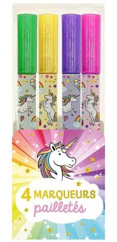 Boîte de 4 marqueurs pailletés vert, jaune, violet et rose à l'effigie des licornes. Taille du marqueur : 13,3 cm.