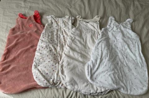 Lot de 4 sacs de couchage pour l'hiver en seconde main (achetés sur vinted). Noah étant né en été, il nous manque certaines choses pour accueillir un bébé d'automne.