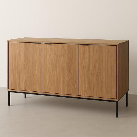 Buffet 3 portes : L.143 P.55 HT.91cm. Dessus du meuble en stratifié / corps du meuble en mélamine / chants ABS ep.2mm. Portes avec poignées en métal / charnières avec amortisseurs.