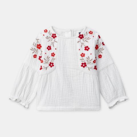 Pour les enfants curieux et délicats, ce chemisier léger est parfait pour les journées douces de mi-saison. Sa coupe droite et son ouverture intégrale au dos par boutons offrent confort et praticité au quotidien. L'empiècement brodé de fleurs bordeaux, corail et beige ajoute une touche raffinée, dans un univers élégant