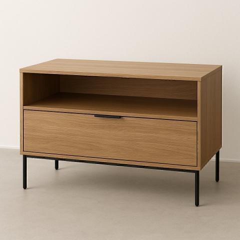 Dessus du meuble en stratifié / corps du meuble en mélamine / chants ABS ep.2mm. Le meuble est munis de pieds fixes en acier, ton noir.