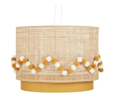 Abat jour rotin et tissu jaune décoré de pomponsécrus et jaunes LOUNA