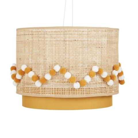 Un bel abat-jour pour suspension en rotin et tissu jaune décoré de pompons écrus et jaunes pour donner du caractère à la chambre de bébé