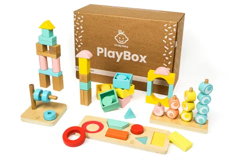Les Playbox de Oh My Baby contiennent des jouets bébé Montessori en bois, des hochets et des anneaux de dentition, des jeux liés à l'âge de l'enfant et à son éveil.