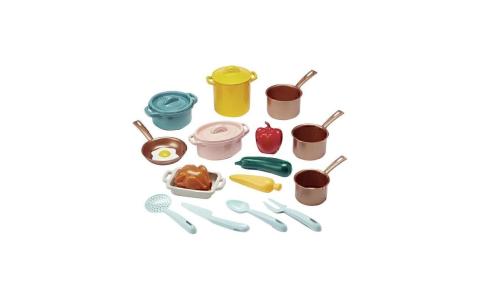 Avec ces belles casseroles, la boite de rangement servant de cuisinière et ces appétissants ingrédients, votre enfant aura de quoi préparer un bon repas à