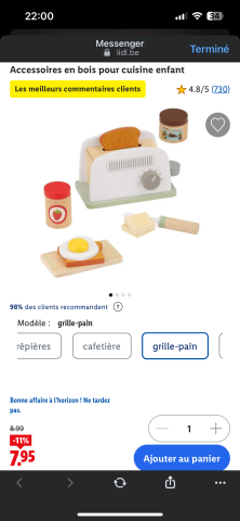 Ce produit est extrait d'une liste de cadeaux (Anniversaire, Noël, ...) déposée sur Kadolog. Kadolog permet de créer des listes de cadeaux (Anniversaire, Noël, ...) en toute liberté. Il est possible d'ajouter toutes vos envies cadeaux et de recevoir les dons directement sur votre compte. Avec les dons reçus, vous êtes alors libre d'aller acheter vos produits (comme ce 'Accessoires en bois pour cuisine enfant | Lidl.be ') où et quand vous le souhaitez.