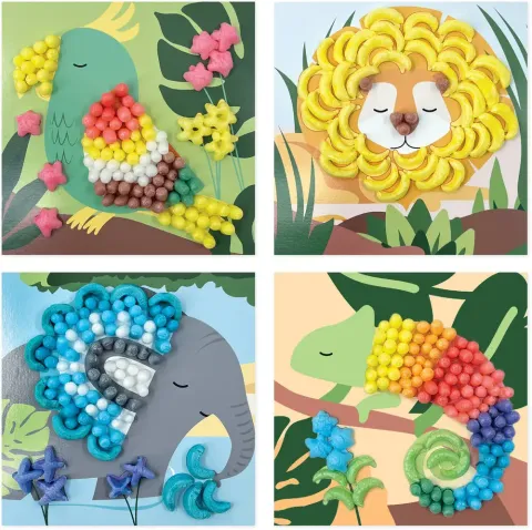 Grâce à ces 4 cartes à décorer représentant les animaux de la jungle (le lion, l’éléphant, le caméléon et le perroquet), les enfants pourront développer leur motricité fine. Ce coffret contient des flocons de maïs de 8 formes et de 16 couleurs différentes à venir coller sur les cartes pour révéler les couleurs des animaux en 3D. Les MaxiCorn sont des flocons multicolores, 100% biodégradable, constitués de maïs naturel, d’eau et de colorants alimentaires. Humidifiez une face du flocon, l’amidon du maïs ressort et sert de colle en séchant. Les flocons de maïs collent sur le papier, le carton, le polystyrène et sur toutes surfaces lisses.