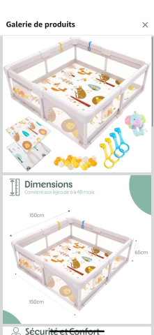 Ce produit est extrait d'une liste de cadeaux (Anniversaire, Noël, ...) déposée sur Kadolog. Kadolog permet de créer des listes de cadeaux (Anniversaire, Noël, ...) en toute liberté. Il est possible d'ajouter toutes vos envies cadeaux et de recevoir les dons directement sur votre compte. Avec les dons reçus, vous êtes alors libre d'aller acheter vos produits (comme ce 'Akeraq Modular Baby Playpen, 150 x 150 cm, Modular Playpen, Baby Playpen with Padded Mat, Breathable Mesh, Rattle, Play Balls and Pull Rings, Portable : Amazon.com.be: Baby Products ') où et quand vous le souhaitez.