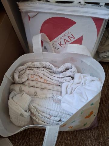 1 alèse couffin, 1 housse couffin, 1 housse lit cabane et 5 tetras chinés en brocante