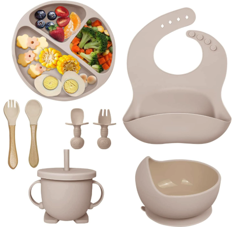 Hoidokly Coffret Repas Bebe Silicone, Lot de 8 Pièces Assiette Ventouse pour Bébé, Bavoir Bebe, Couvert Enfant et Tasse Apprentissage en Silicone sans BPA - Pratique et Facile à laver - Beige