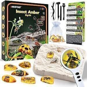 AMOSTING Science et Jeu - Pierre précieuse d'ambre - fossiles d'insectes en résine Artificielle - kit de fouille avec Outil de creusement, loupe, Guide d'étude et Pochette - pour Enfant 6+ Ans : Amazon.fr: Jeux et Jouets