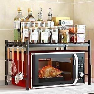 AMZJMT Etagere micro ondes extensible à 2 niveaux, etagere micro onde vertical avec 4 crochets en S,support de cuisine pratique pour plan de travail, organisateur de cuisine, noir : Amazon.com.be: Cuisine et maison