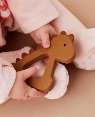 joli anneau de dentition, en caoutchouc 100% naturel, soulagera bébé pendant les moments plus difficiles de la poussée dentaire. Le dinosaure est facile à saisir par les petites mains de bébé dès la naissance. Avec sa sympathique bouille, il est de merveilleuse compagnie dès les premiers mois d'éveil de bébé.