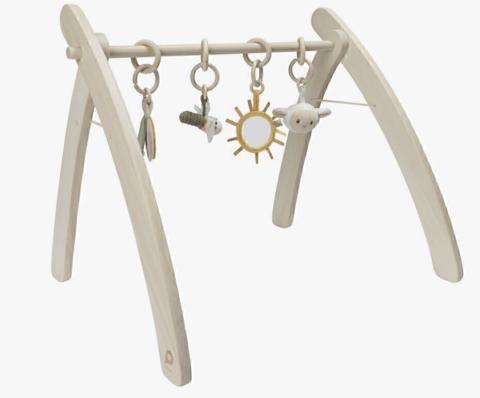 Cette arche de jeux en bois accompagne les premiers moments d’éveil de bébé tout en stimulant ses sens.