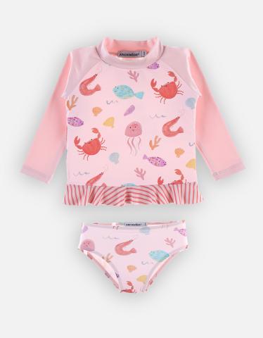 Avec ce set composé d'un top UV et une culotte de bain rose imprimés de jolis animaux de la mer, votre enfant est prêt à partir en quête d'aventures aquatiques ! Grâce à sa composition, il bloque les rayons de soleil nocifs pour la peau. Les parties du corps découvertes doivent être protégées par un produit solaire à haut indice, des lunettes et un chapeau.