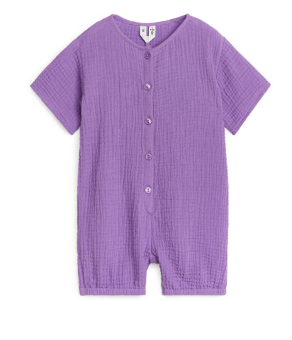 Short-sleeved jumpsuit in a soft muslin crafted from cotton. Puffy short legs with elastics at bottom hem. Snap buttons at front and in crotch for all sizes except 86-92.