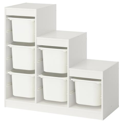 TROFAST combinaison structure + bacs, blanc/blanc, 99x44x94 cm Les enfants ont besoin de rangements spacieux pour leurs affaires. La série TROFAST est composée de caissons en bois, de rangements en filet et de bacs en plastique (min. 50 % recyclés). Facile à tirer vers soi, à transporter et à remettre en place.