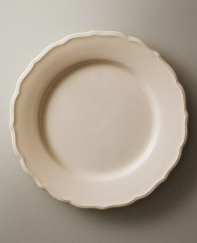 Assiette plate en faïence de couleur écrue. Modèle uni orné d’un relief décoratif sur le bord.