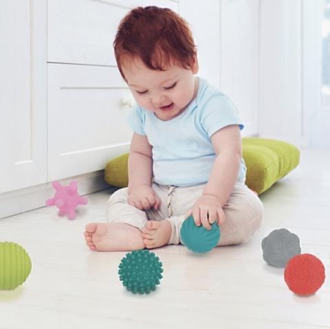 Les balles sensorielles se prêtent à une multitude de jeux. Nervurées, lisses ou à picots, grandes ou petites toutes les balles stimulent le sens du toucher, la dextérité et la coordination des mouvements de bébé. Leur matière en plastique souple et léger soulage les petites dents de bébé et garantit une hygiène parfaite !