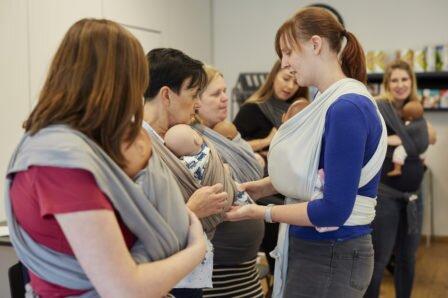 Un atelier d'apprentissage des différentes positions et méthodes de portage, de toutes les ficelles pour nouer une écharpe extensible et de test de différents porte-bébés et écharpes de portage.