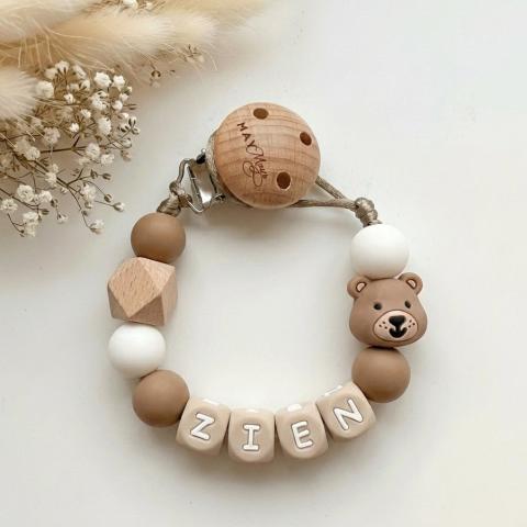 Attache-tétine personnalisée avec le nom de Tom, marron et blanc.