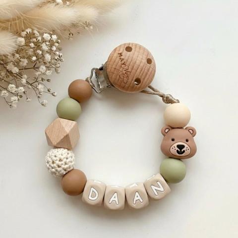 Attache-tétine verte avec le nom de l'ours. Fait main, sûr et toujours joliment emballé.