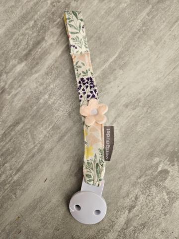 Voici un bel attache-tétine pour m'éviter de la perdre en me promenant.